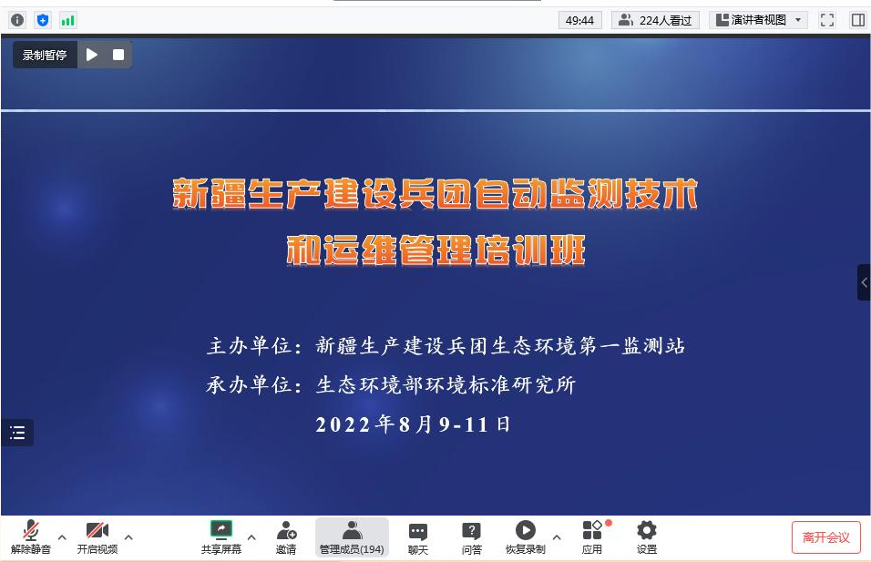 2022年8月9-11日,新疆生產(chǎn)建設兵團生態(tài)環(huán)境第一監測站委托生態(tài)環(huán)境部環(huán)境標準研究所,組織舉辦了“新疆生產(chǎn)建設兵團自動(dòng)監測技術(shù)和運維管理培訓班 ”,來(lái)自新疆生產(chǎn)建設兵團各區域監測站、各師監測站的業(yè)務(wù)骨干以及企業(yè)環(huán)保骨干累計415人線(xiàn)上參加了該次培訓。